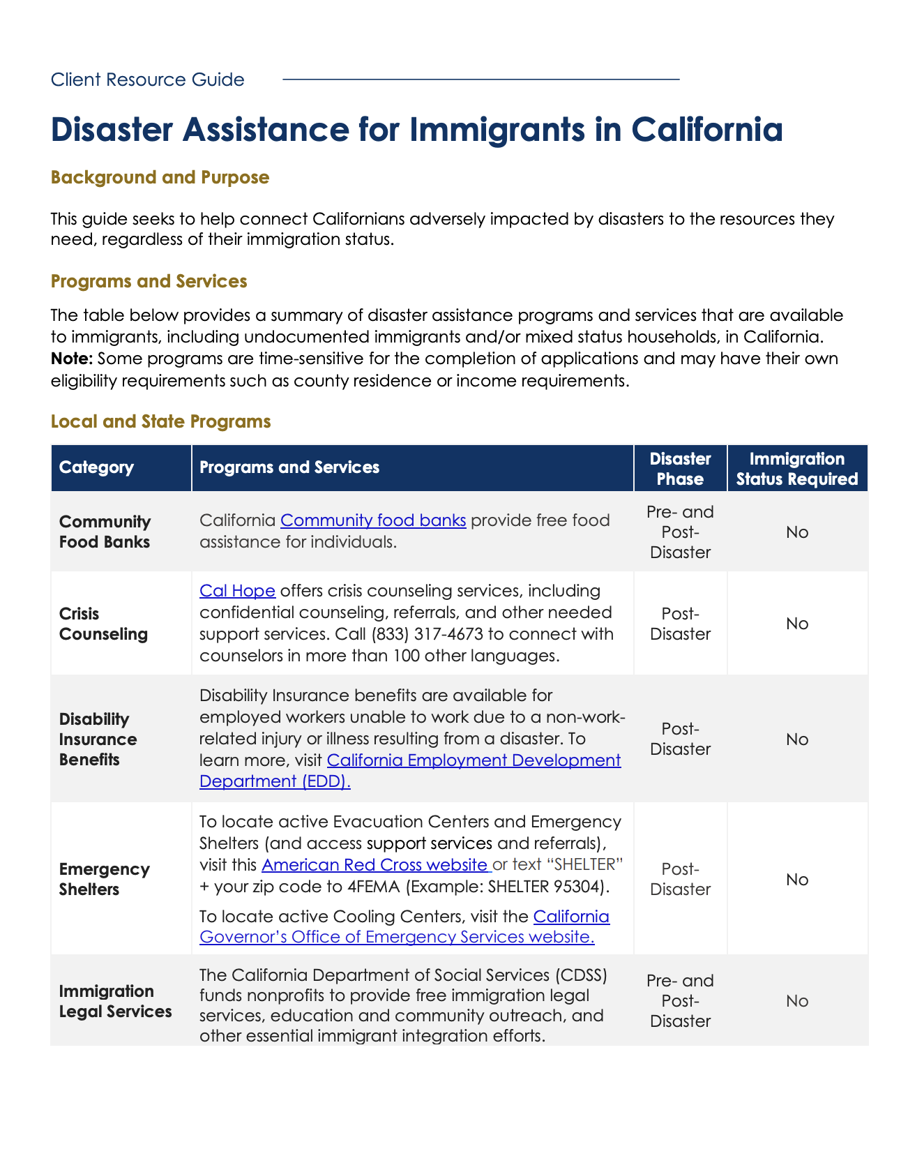 This guide from the California Department of Social Services seeks to help connect Californians adversely impacted by disasters to the resources they need, regardless of their immigration status.