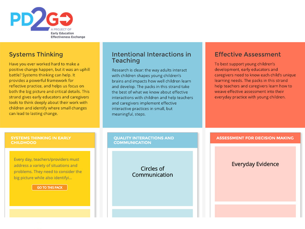 PD2GO (Professional Development 2 Go) is an innovative approach to early childhood professional development based on this research. Each professional development experience (or “pack”) included in this collection focuses on continuous quality improvement in early learning programs.