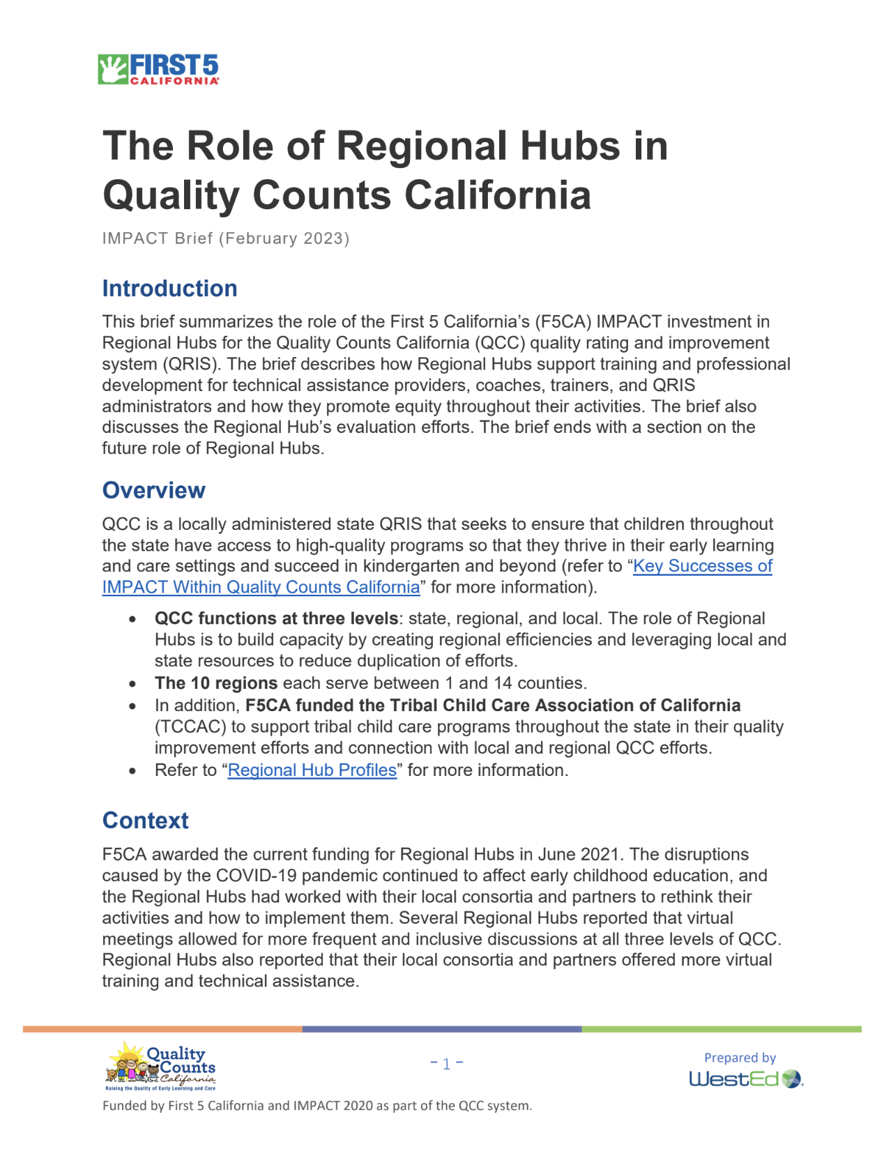 The Role of Regional Hubs in Quality Counts California IMPACT brief describes how Regional Hubs support training and professional development for technical assistance providers, coaches, trainers, and quality rating and improvement system administrators and how they promote equity through their activities. The brief also discusses Regional Hub’s evaluation efforts and looks ahead to the future role of Regional Hubs.